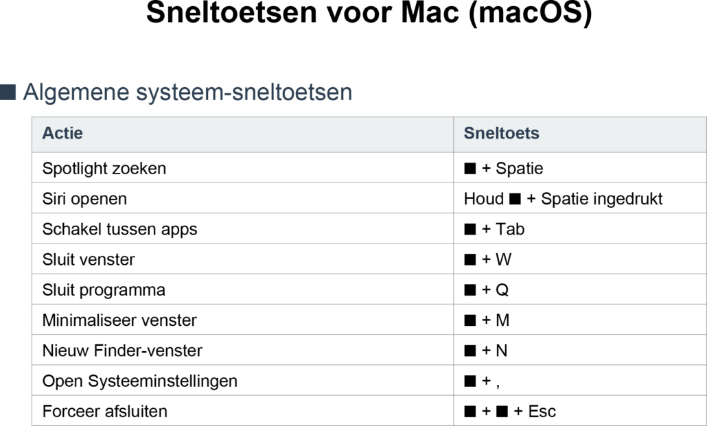 Hier is een overzichtelijke lijst met veelgebruikte sneltoetsen voor Mac (macOS) — handig voor dagelijks gebruik, productiviteit en systeemnavigatie.